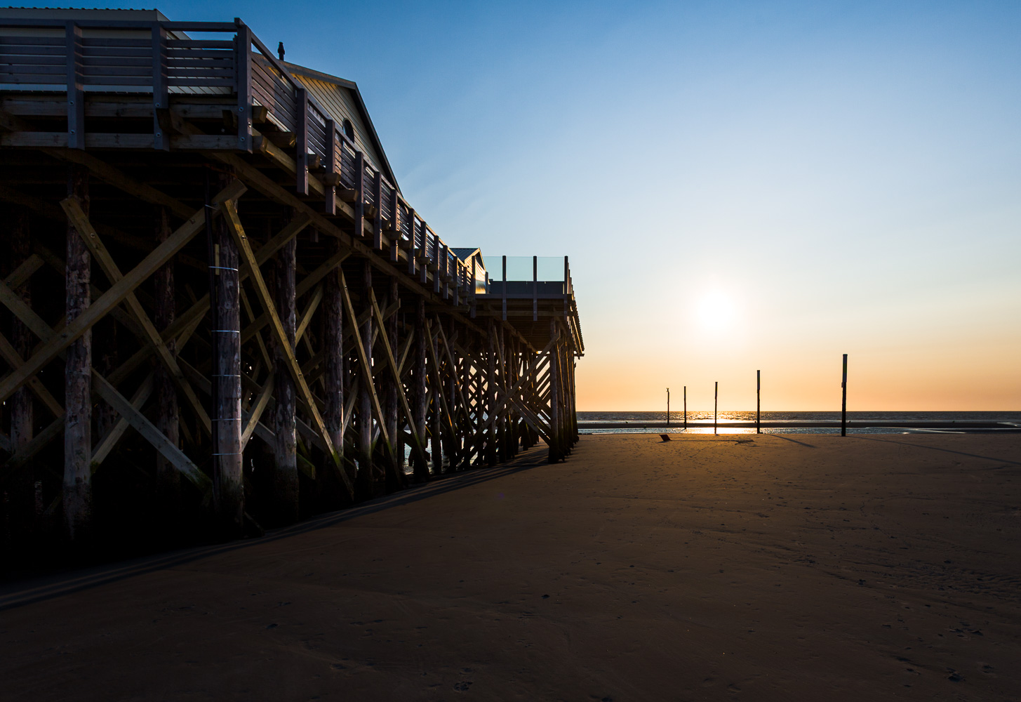 Das 54° Nord in St. Peter-Ording ragt im Anschnitt ins Bild, seine mächtigen Holzpfähle liegen im Schatten des Gegenlichts.