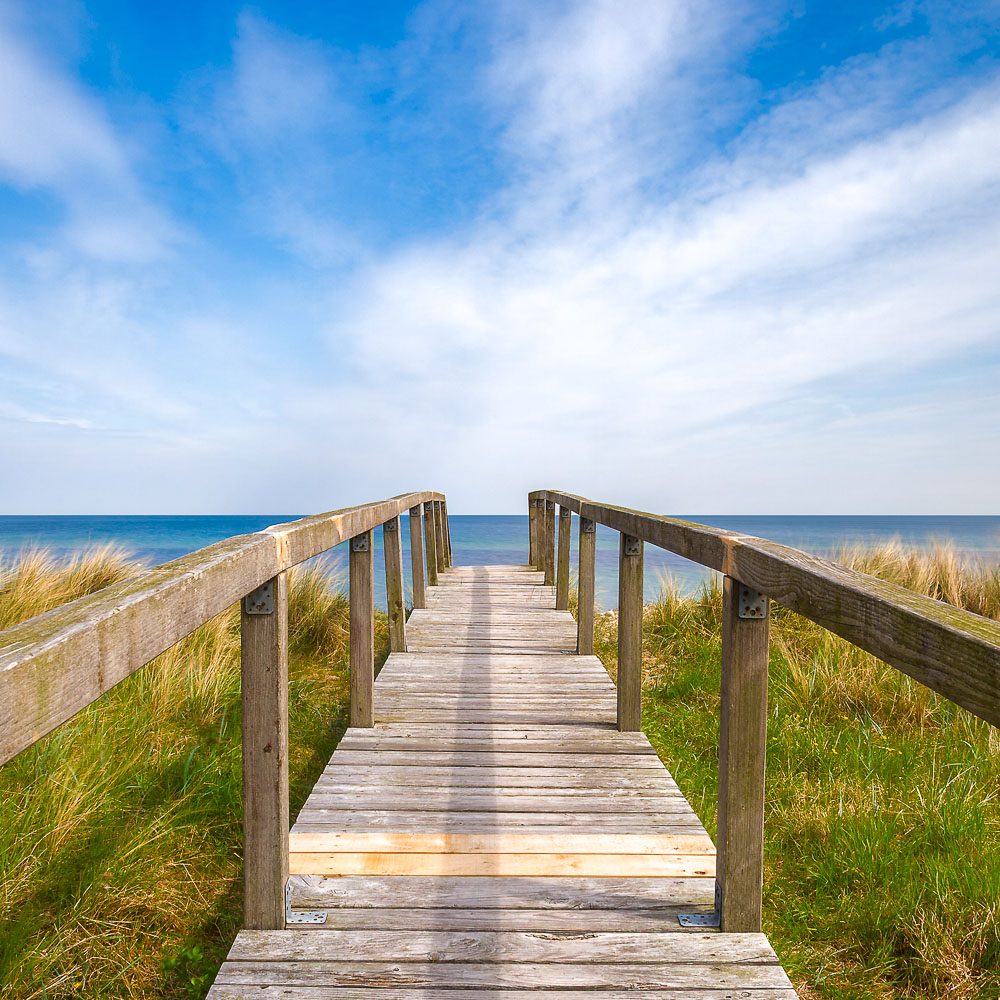 Eine Holzbrücke über die Dünen mit Blick auf die grün-blau strahlende Ostsee an einem sonnigen Tag an der Hohwachter Bucht.