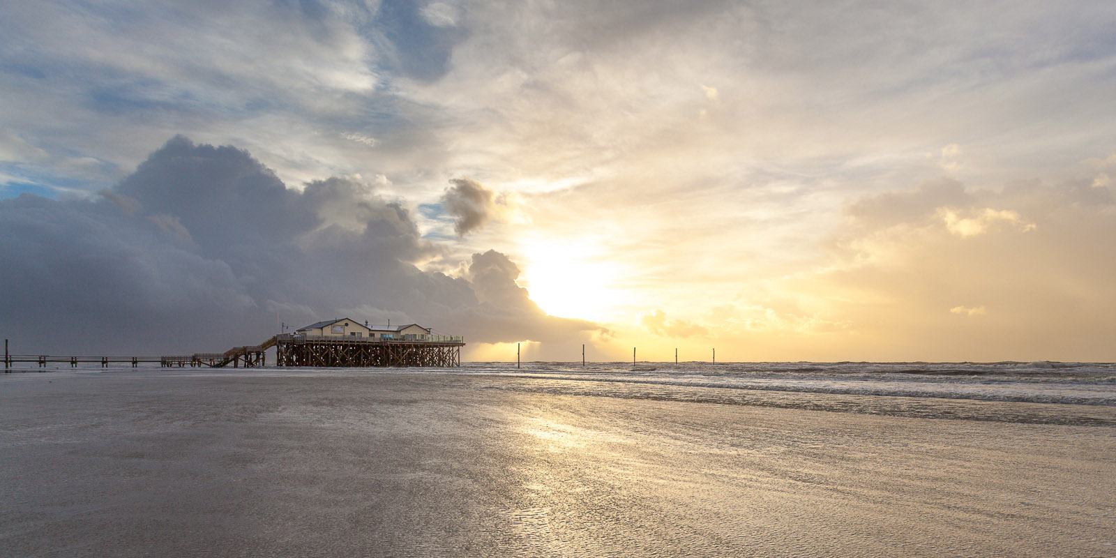 Über dem Strand von St. Peter-Ording türmen sich gewaltige Wolkenmassen, dunkel und schwer, wie aus einer anderen Welt.