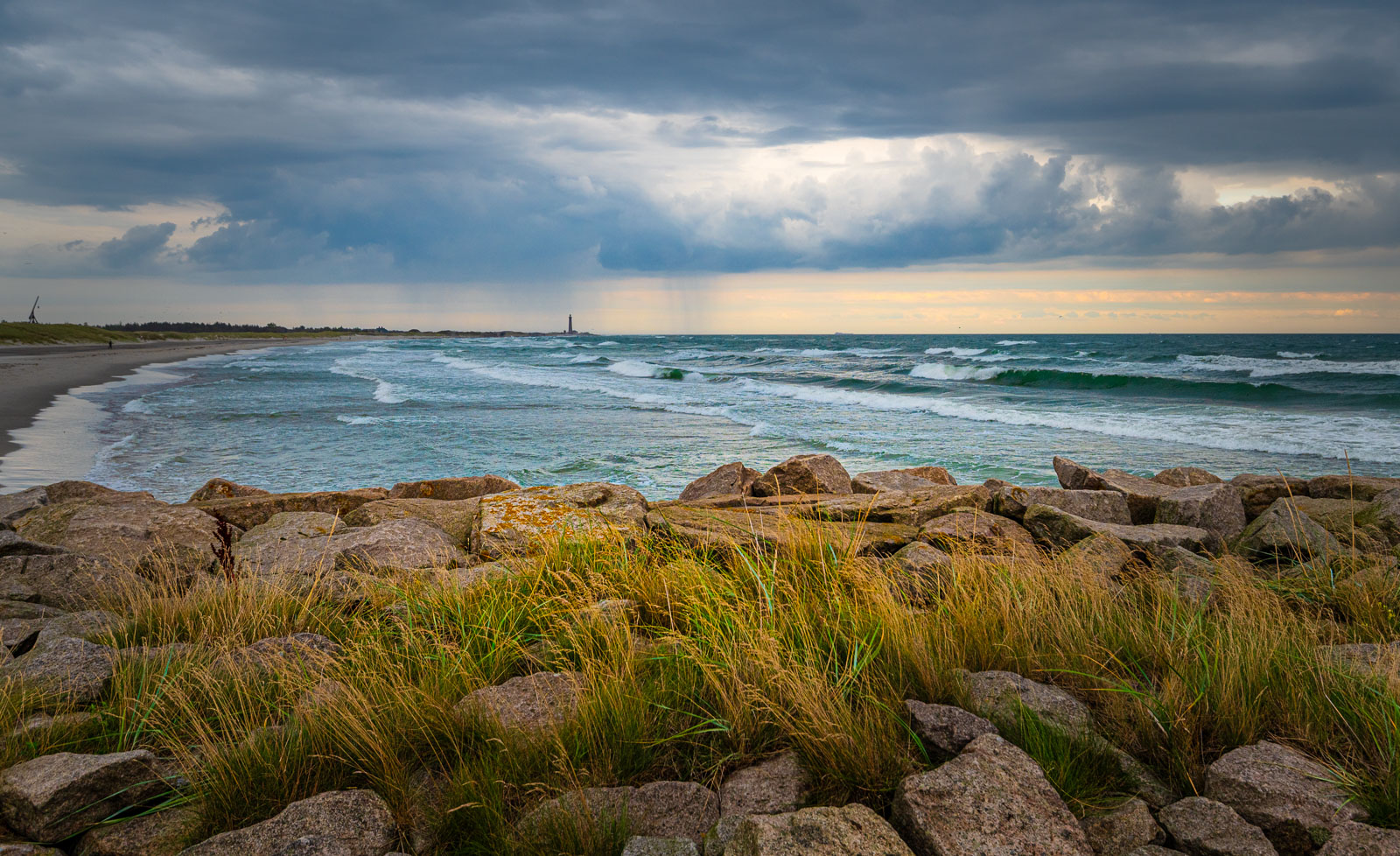 Der Oststurm treibt aus dem Kattegat und schwere Regenschauer gehen über dem Meer nieder.