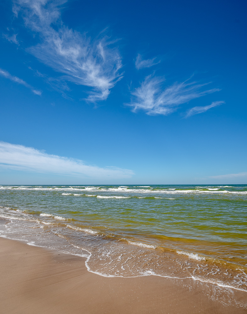 Die Brandung ist sanft, aber stetig, sie trägt Bewegung in die ruhige Weite. Der ferne Horizont ist eine scharfe Linie zwischen Wasser und Himmel.