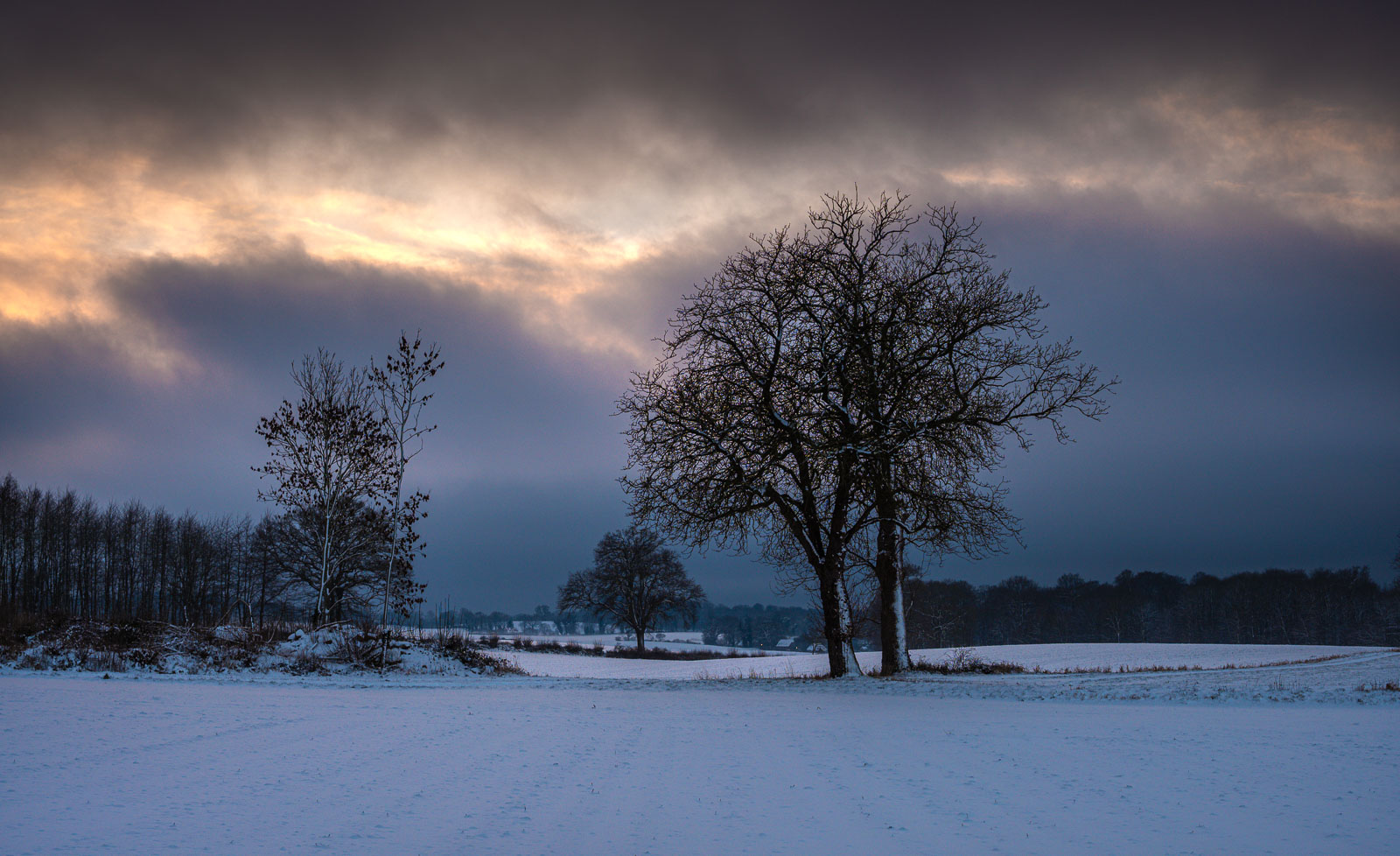 Die dichte, dunkle Wolkendecke reisst auf und das warmen Licht des Abends zeigt sich über den schneebedeckten Feldern bei Heikendorf