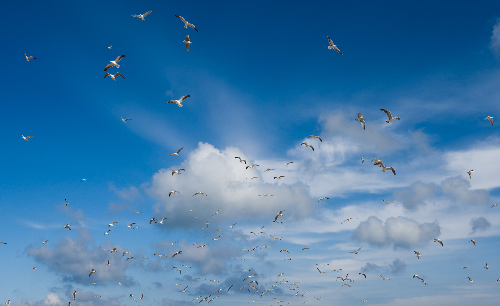 Davor ziehen unzählige Möwen ihre Kreise. Manche gleiten ruhig, andere schlagen kräftig mit den Flügeln – die Bewegungen überlagern sich zu einem dynamischen Muster.